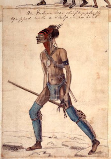 An Indian War chief completely equipped with a scalp in his hand